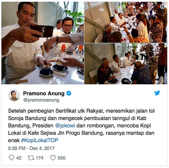 Usai menyelesaikan agenda tersebut, presiden dan rombongan menyempatkan mencicipi kopi lokal di kafe Sejiwa, Bandung.